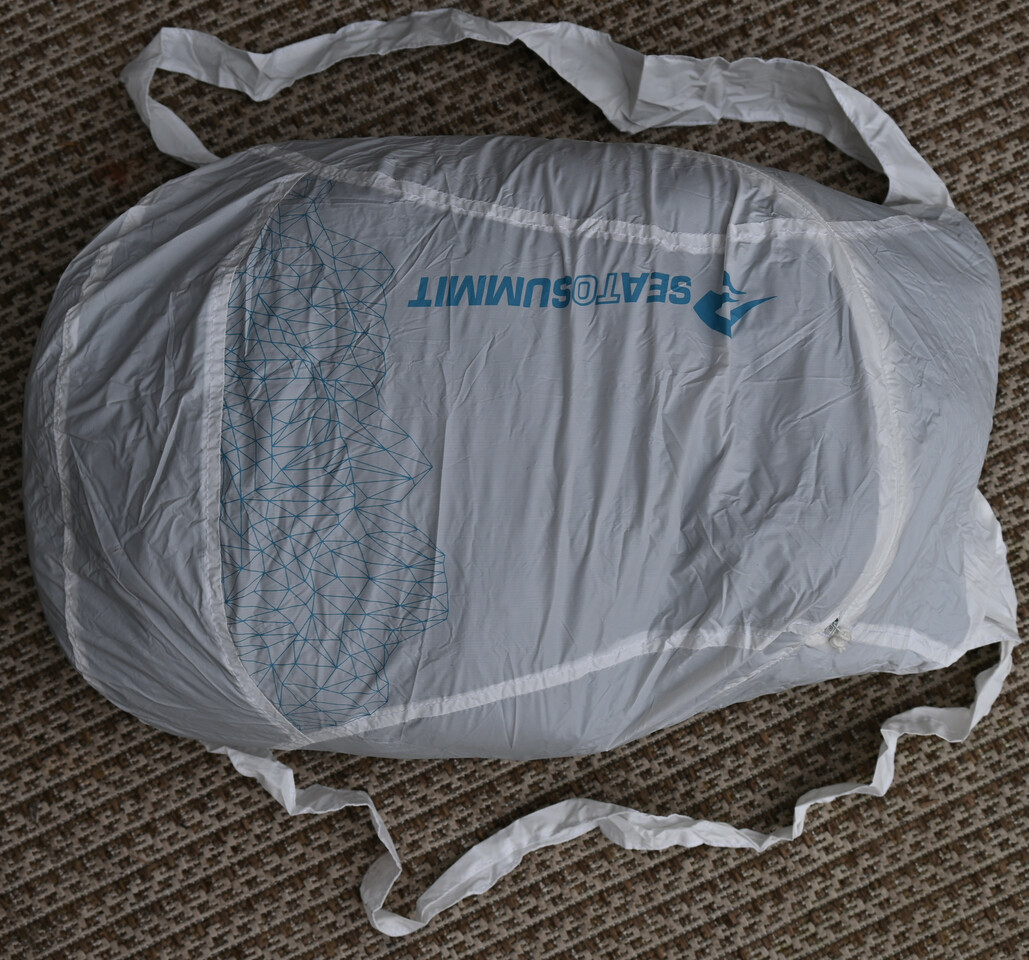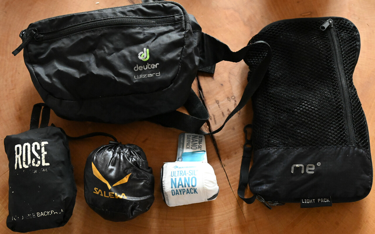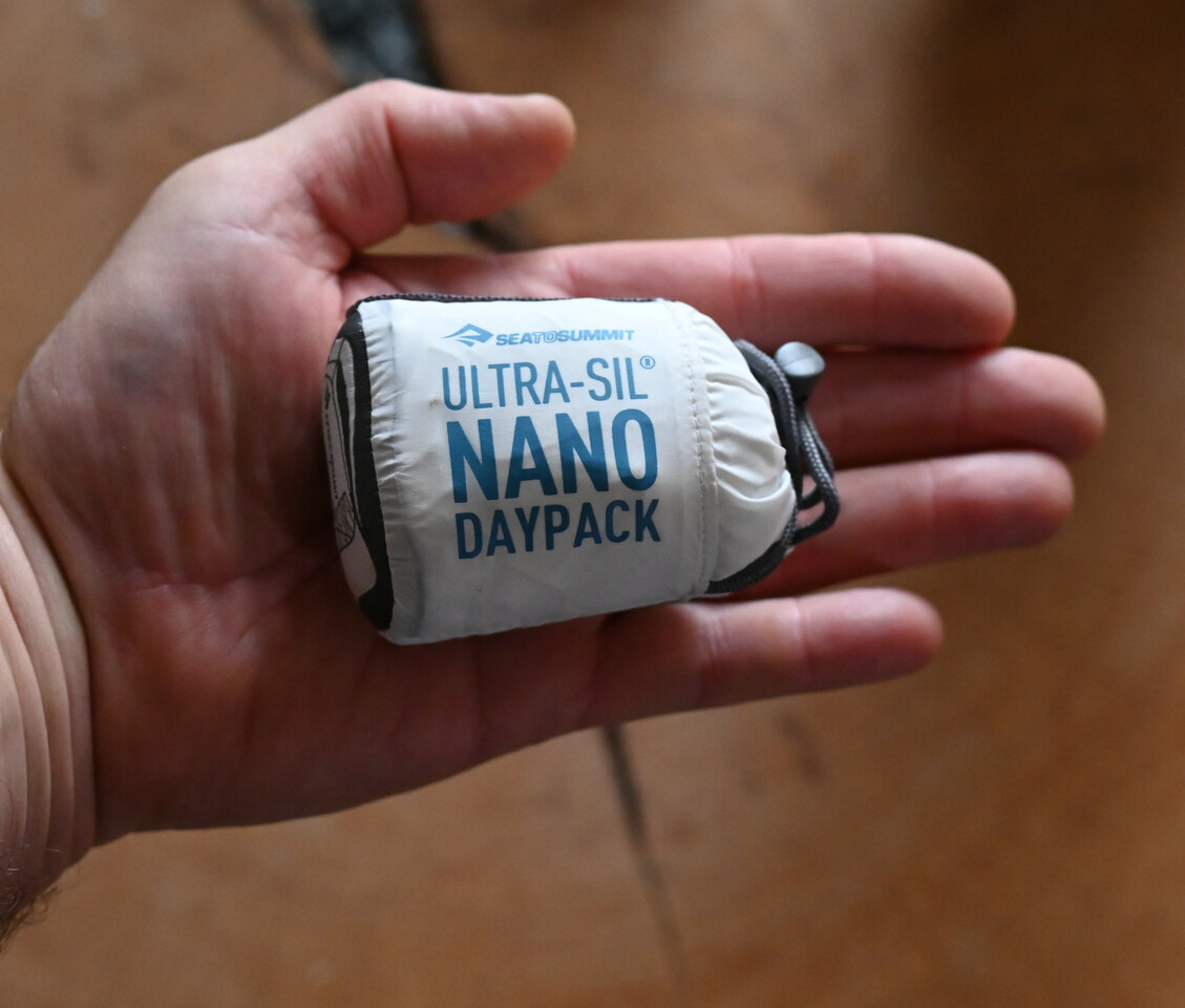 Vorletztes Jahr haben wir in Marseille nach einem Faltrucksack gesucht, da wir unsere auf dem Campingplatz vergessen hatten und noch einkaufen wollten. In einem kleinen aber sehr gut sortierten Outdoorladen haben wir einen tollen gefunden - die hatten den Nano von Sea to Summit in schwarz und Pacific blue. Sabine wollte den blauen, also haben wir den mitgenommen. Der Nano ist unglaublich klein und leicht (30 Gramm) und mir ist erst hinterher aufgefallen, dass der ideal zum Einkaufen beim Bikepacking ist. Leider hat Sea to Summit den Nano inzwischen durch den Ultra -Sil abgeloest. Der hat statt 18 Liter Volumen dann 20 Liter Volumen - wiegt aber auch doppelt so viel.