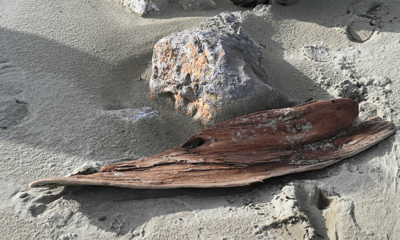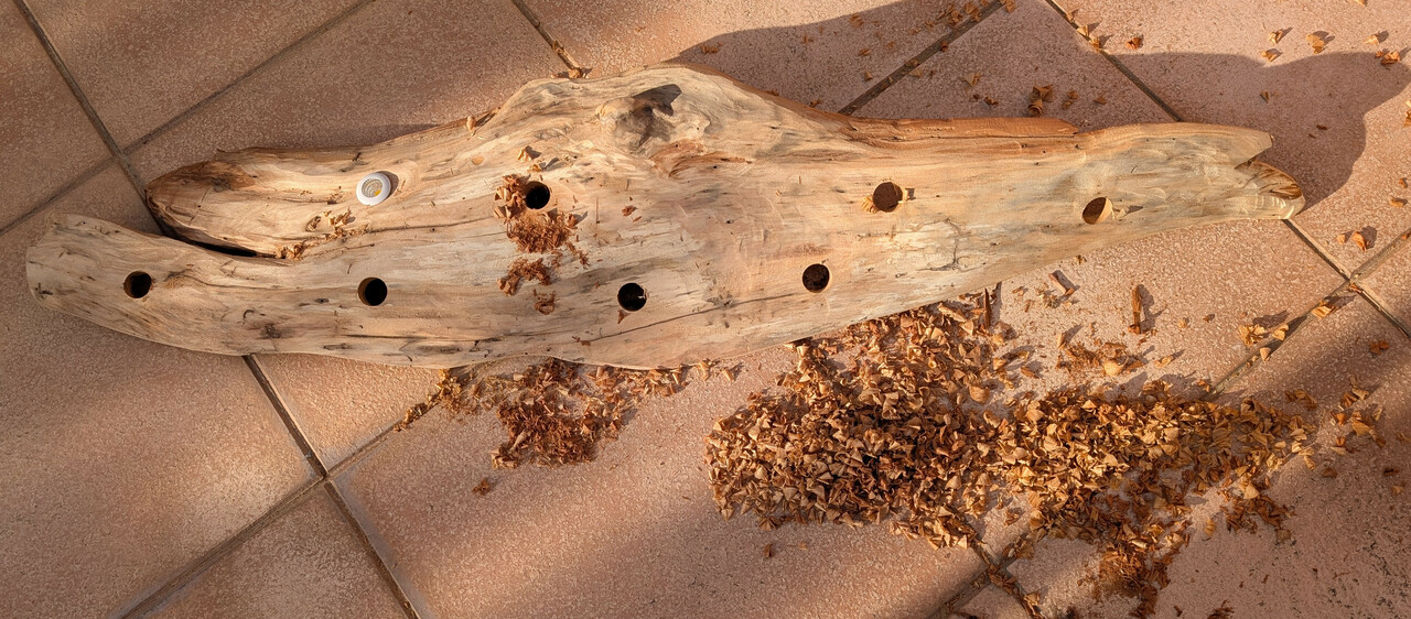 Als naechstes haben wir am Strand von Gruissan ein passendes Stueck Treibholz gesucht und sind beim ersten Ausflug auch gleich fuendig geworden. Ein ca. ein Meter langes Stueck Holz am Strand haben wir mitgenommen - ich habe es zu Hause ausfuehrlich abgeschliffen bis alle angemoderten Stellen weg waren.