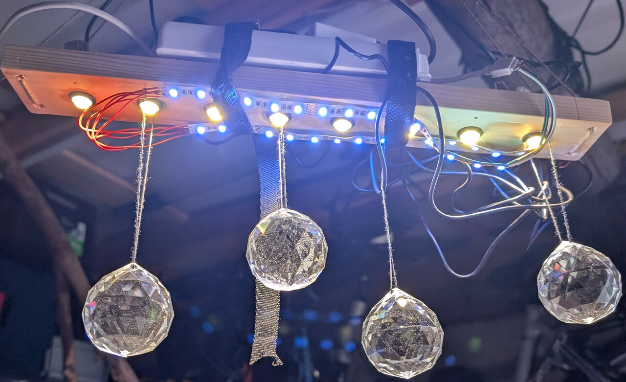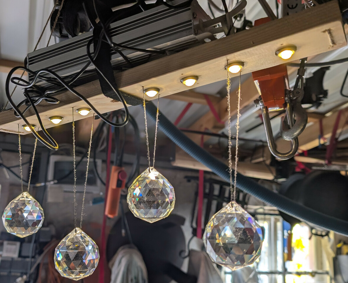 Bei den Kristallen haben mir geschliffene Glaskugeln mit 20 mm und 50 mm Durchmesser am besten gefallen. Die haenge ich an Angelschnur unter die Spots der Lampe. Spots waren etwas schwieriger auszuwaehlen - folgendes habe ich getestet :