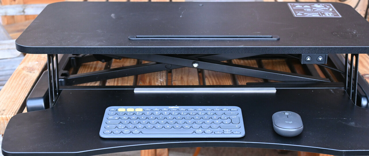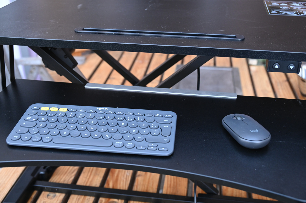 Der Schreibtischaufsatz von Logilink bietet schon fast das. Es gibt eine 80 cm breite und 40 cm tiefe Platte, die sich motorisiert um 32 cm verstellen laesst mit einer Tragkraft von 20 Kilo und davor eine Ablage fuer Tastatur und Maus mit 20 cm Tiefe. Ich bin damit weit genug weg vom Bildschirm, habe genug Platz fuer Maus und Tastatur und es laesst sich weit genug verstellen. Allerdings ist das ganze mit gut 60 cm zu tief fuer das Regal.