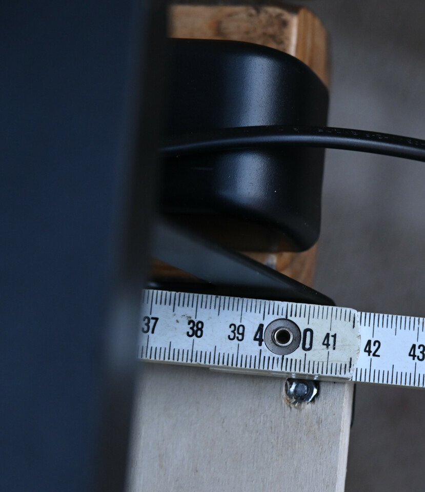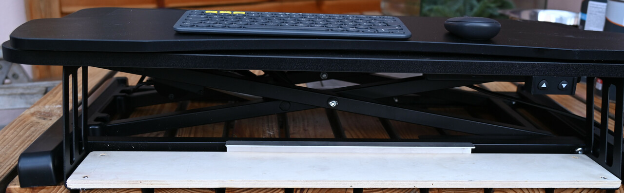 Die Tastaturablage ist mit 4 Schrauben befestigt - das ist zu umstaendlich die jedes mal festzuschrauben, wenn ich das benutzen will - also habe ich das umgebaut. Anstelle der Tastaturablage habe ich ein duennes Brett angeschraubt und hinten an das Brett eine Alu Schiene geschraubt unter der sich die Tastaturablage festklemmen laesst. Das ist stabil genug und laesst sich mit einem Handgriff auf- und wieder abbauen.