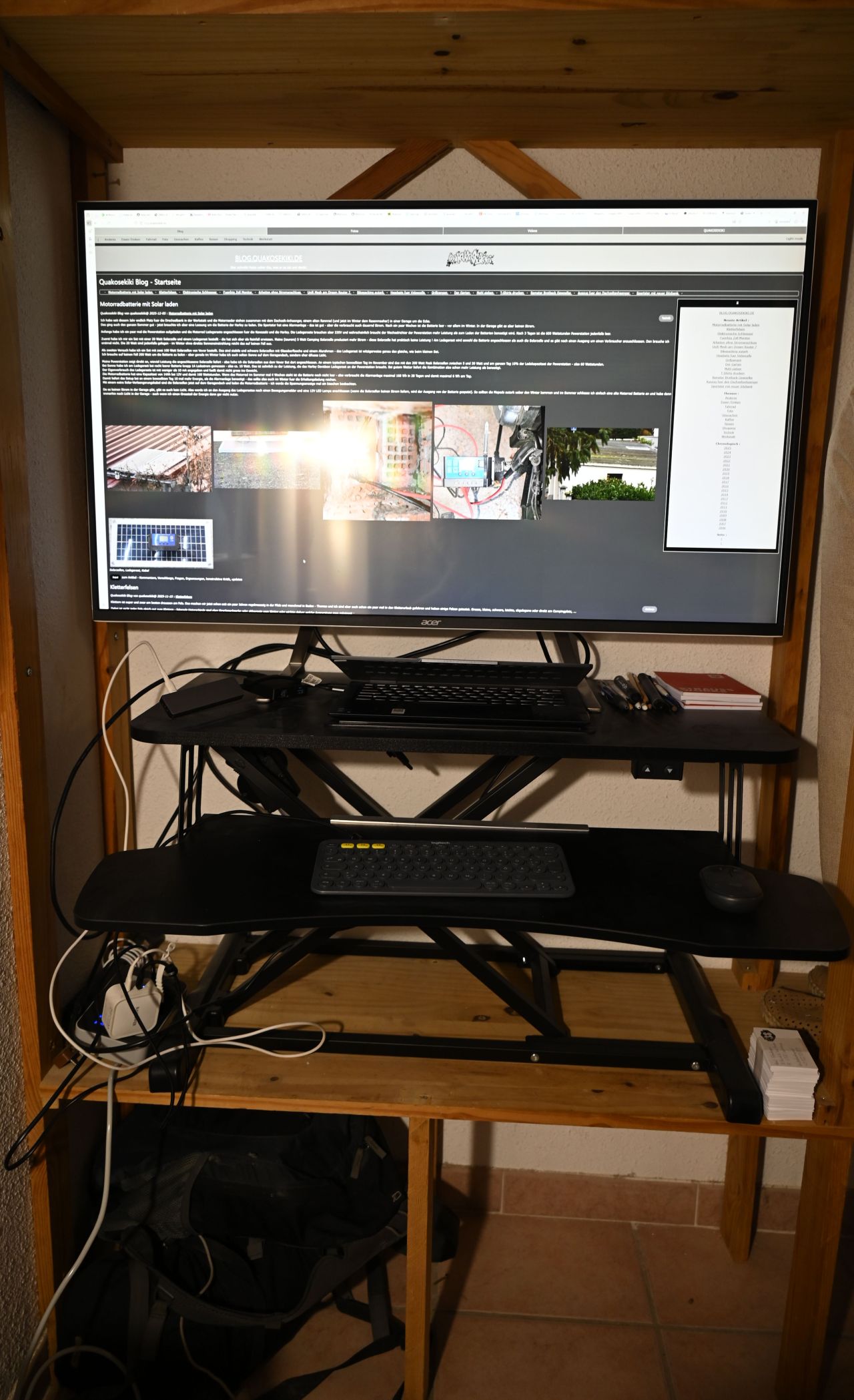 Mit Sonne oder einem modernen und sparsamen Monitor klappt es also auf jeden Fall ohne Stromanschluss zu arbeiten. Fuer das Setup braucht man dann noch ein Verlaengerungskabel - die Powerstation lueftet regelmassig, wenn der Wechselrichter an ist. Ich habe sie in den Nebenraum in einen Schrank gestellt oder nach draussen zum Solarpanel.