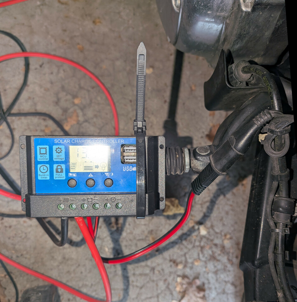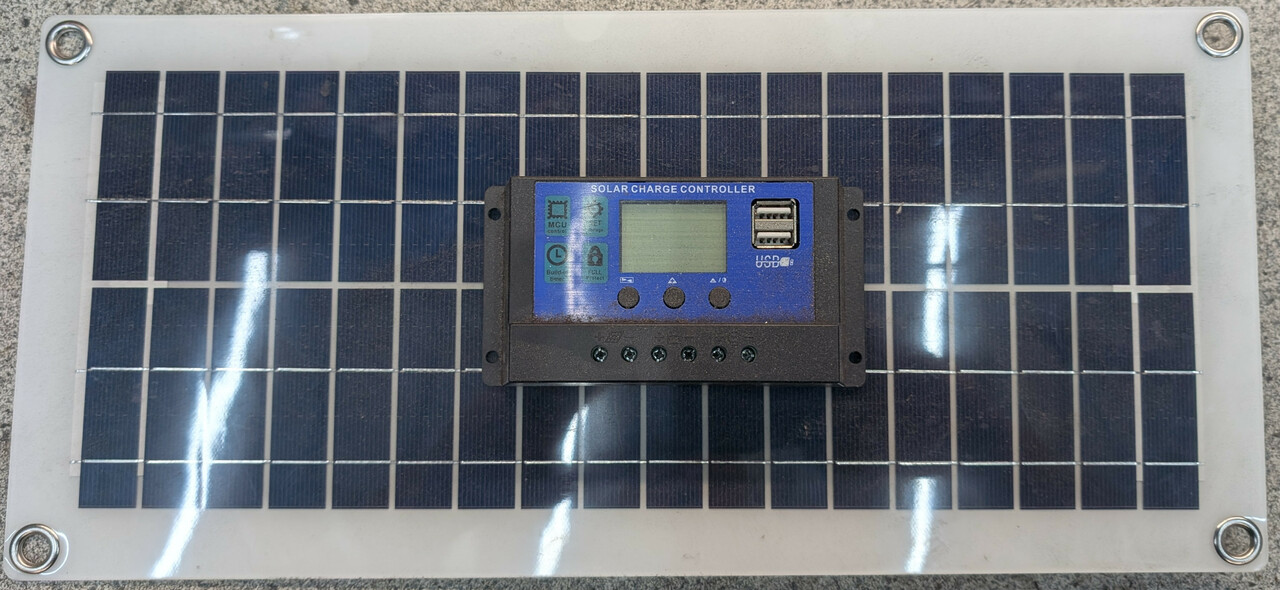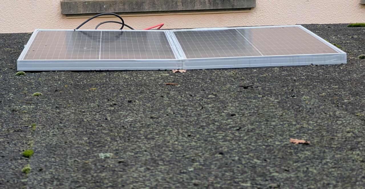 Zuerst habe ich mir ein Set mit einer 20 Watt Solarzelle und einem Ladegeraet bestellt - die hat sich aber als Reinfall erwiesen. Meine (teurere) 5 Watt Camping Solarzelle produziert mehr Strom - diese Solarzelle hat praktisch keine Leistung ! Am Ladegeraet wird sowohl die Batterie angeschlossen als auch die Solarzelle und es gibt noch einen Ausgang um einen Verbraucher anzuschliessen. Den brauche ich erstmal nicht. Die 20 Watt sind jedenfalls gelogen - im Winter ohne direkte Sonneneinstrahlung reicht das auf keinen Fall aus.